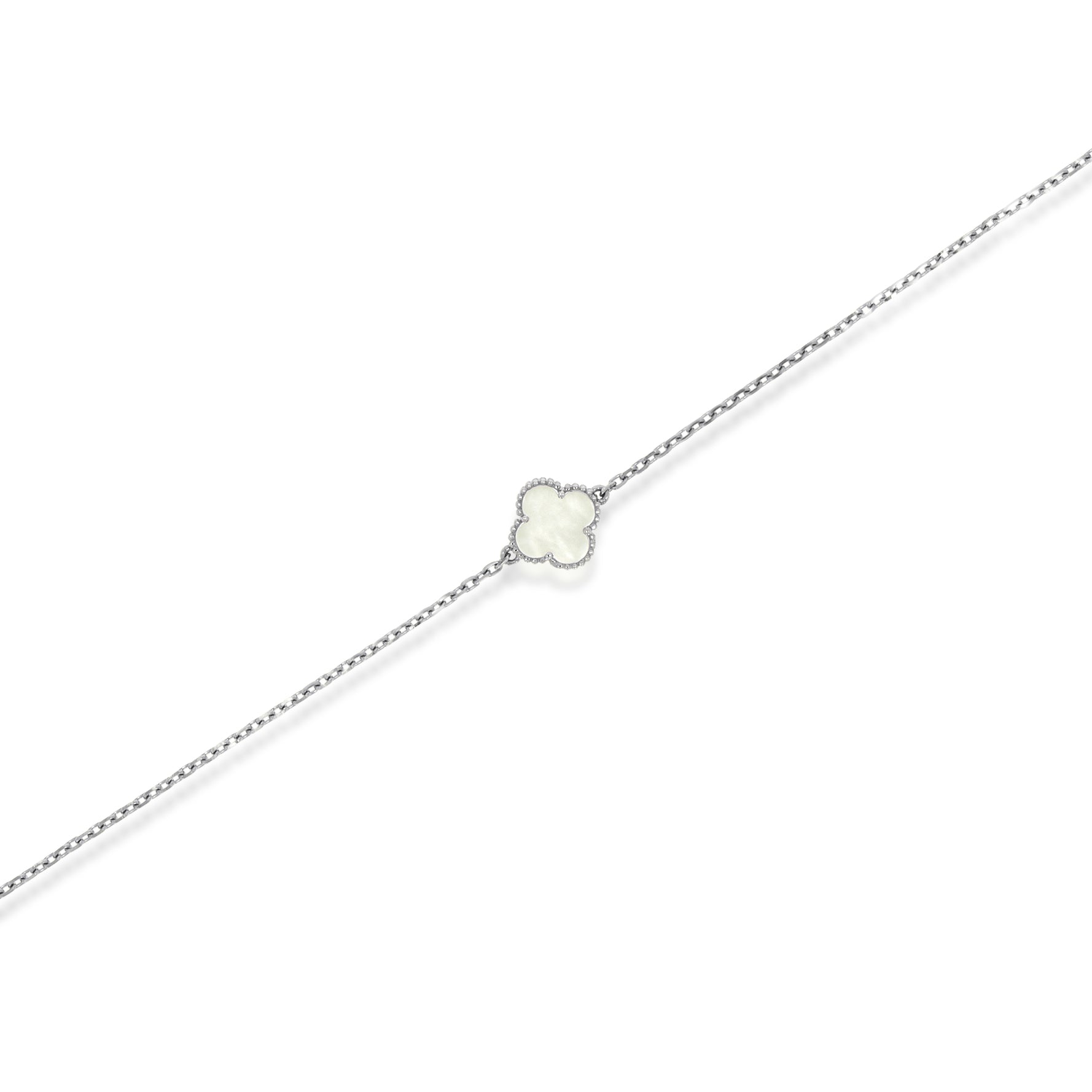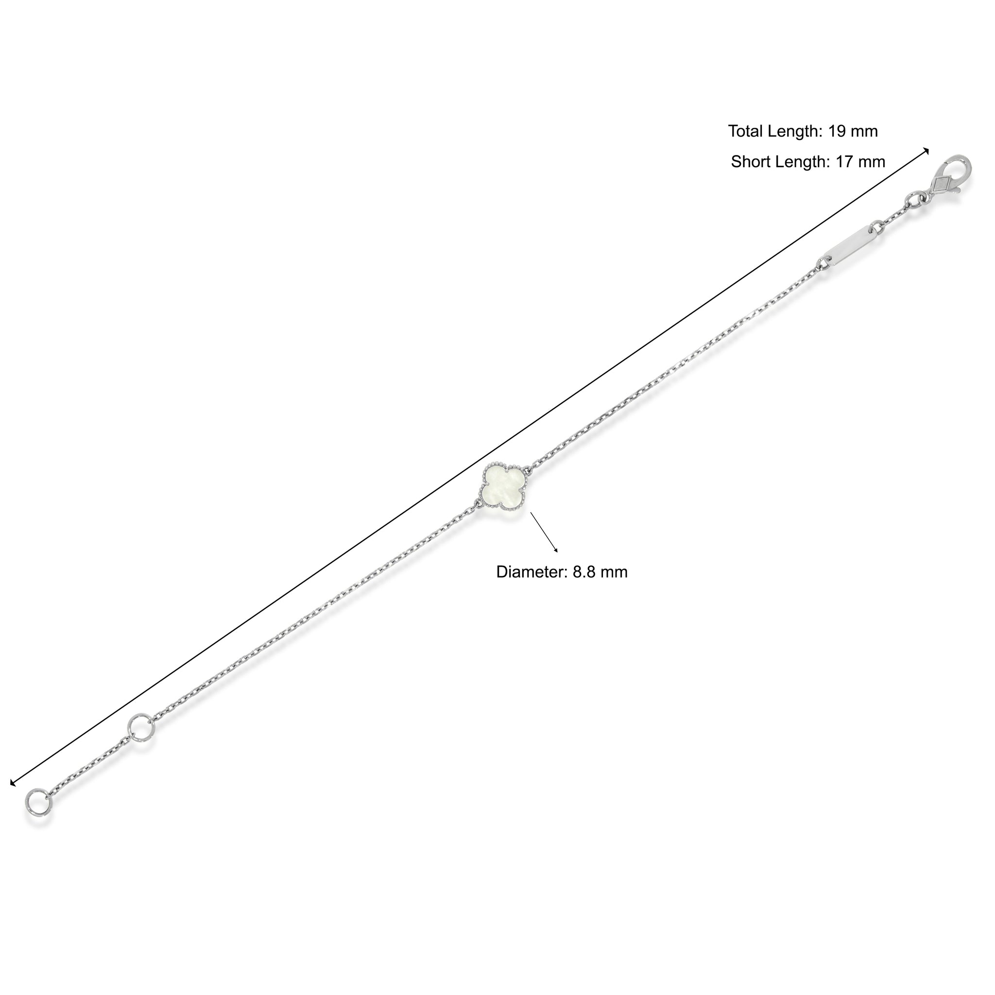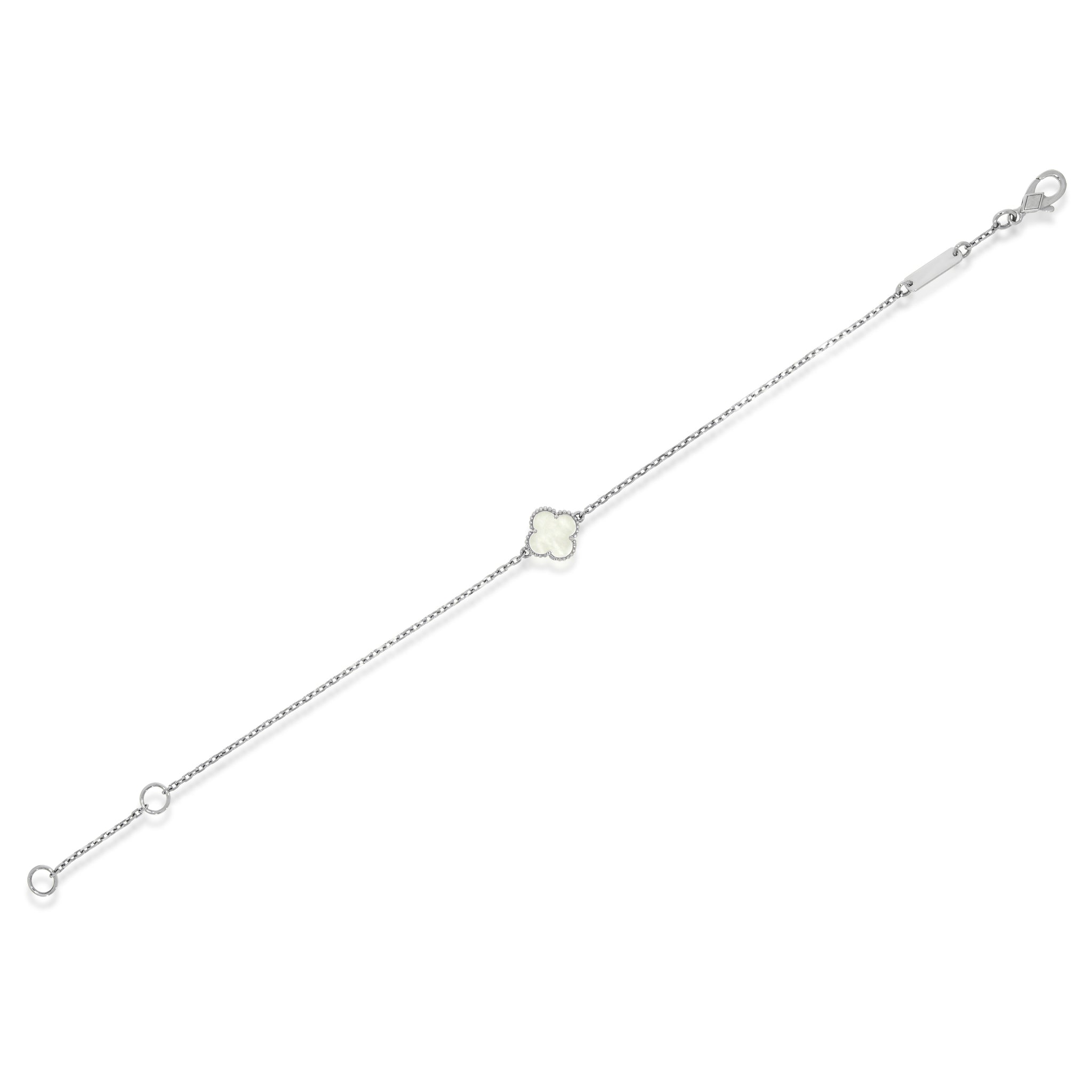 Timeless setting, Mother of pearl Clover bracelet, 18k white gold, 8.8mm diameter, white gold balls Surrounding the Mother pearl.
