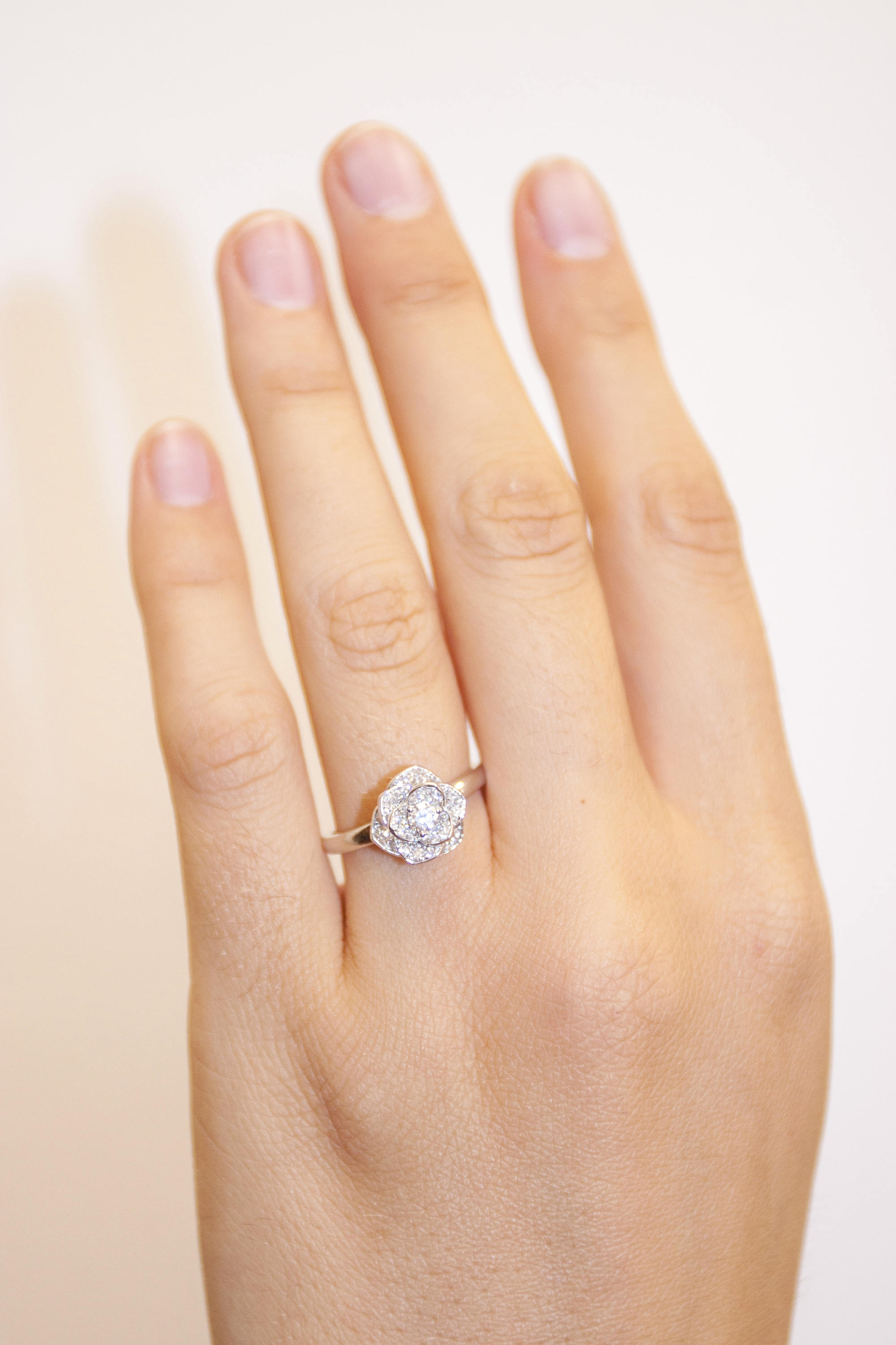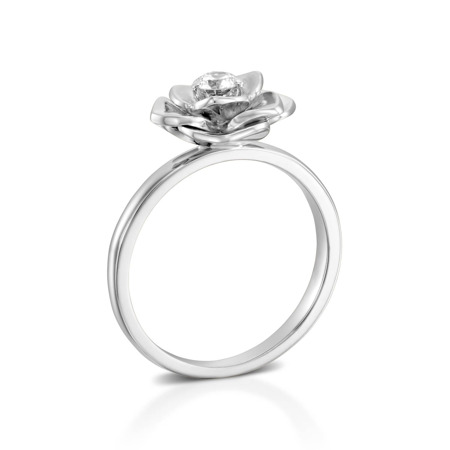 A unique white gold blossom engagement ring inlaid with 0.18 Carat center stone natural diamond, designed with beautiful petals made of 18k white gold