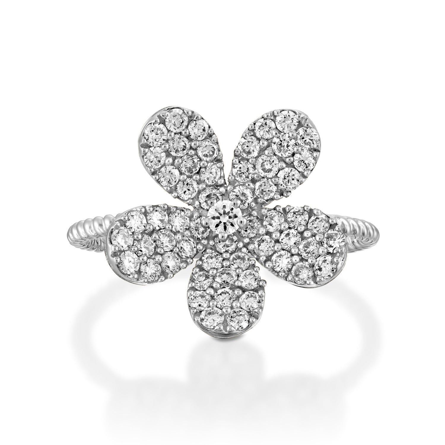 Blooming Flower Shaped Ring with five petals inlaid with 56 natural sparkling diamonds.