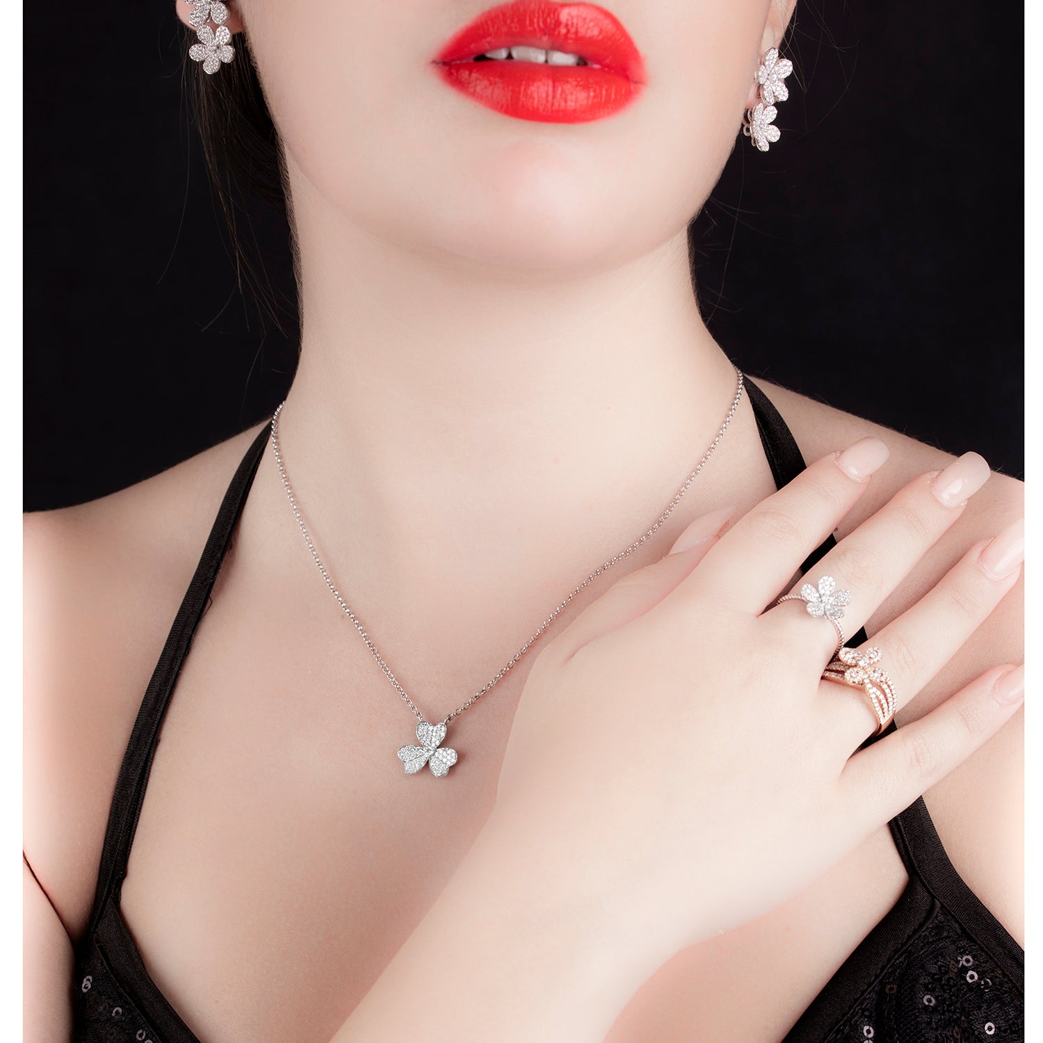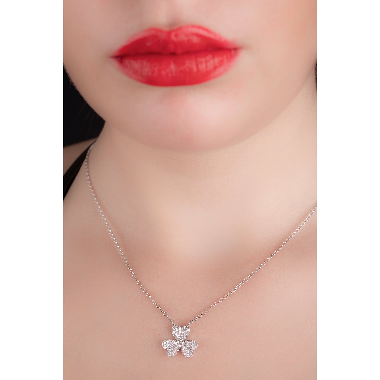 Delicate white gold three leaf clover necklace. pave pendent 0.31 carat white round diamonds.