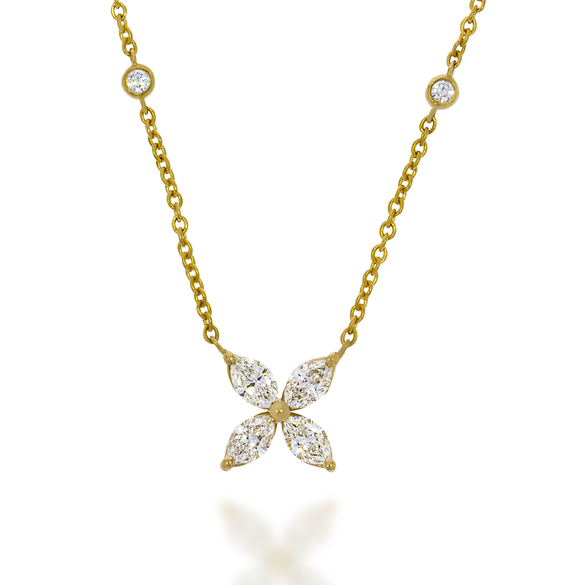 18K yellow gold chain set with 4 round diamonds 0.14 carat, holds a delicate four patal pendant set with 4 marquise diamonds 0.90 carat.