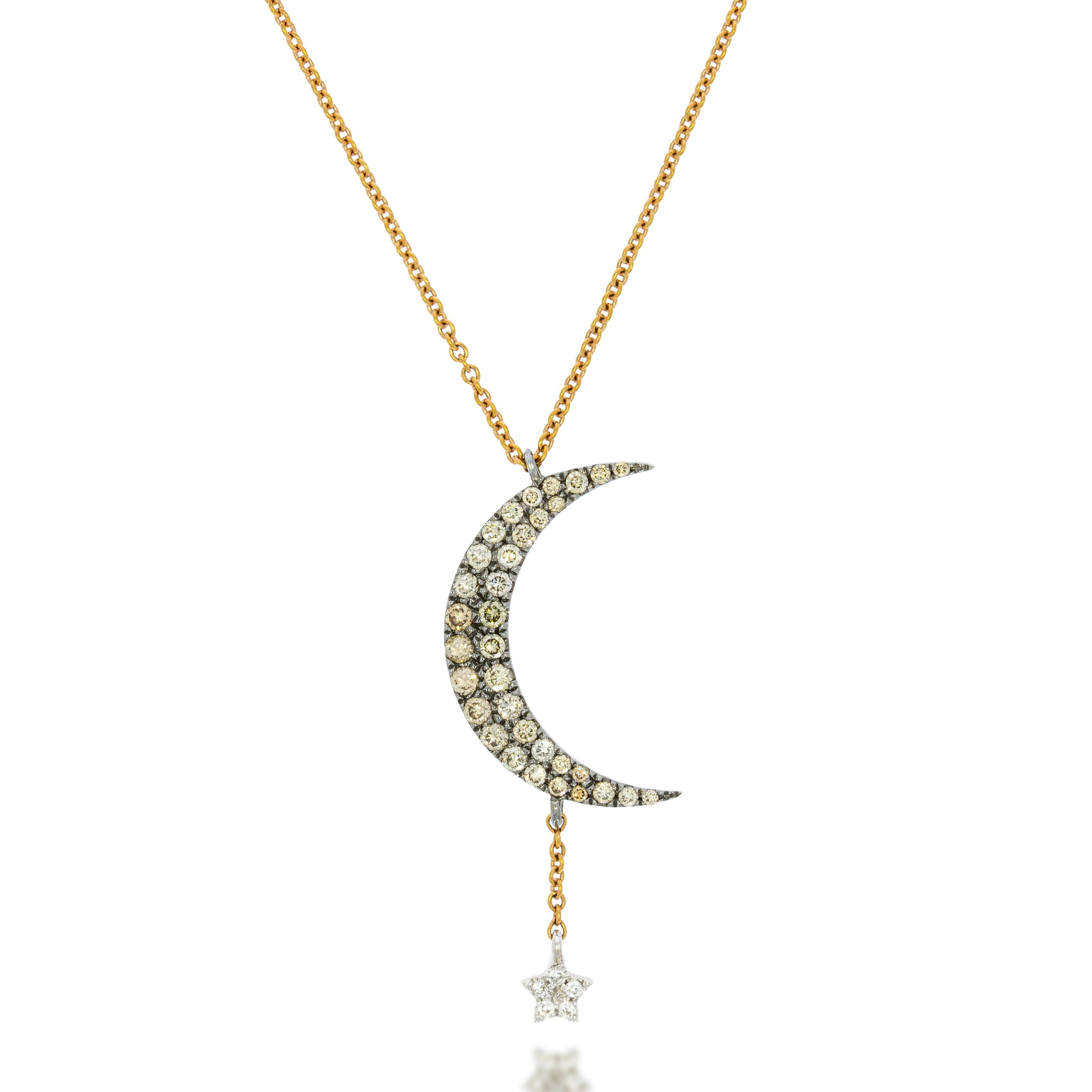 Intricately designed Crescent Moon Diamond Pedant. 18k white gold set with Round Champagne and White Diamonds + droping diamonds star.