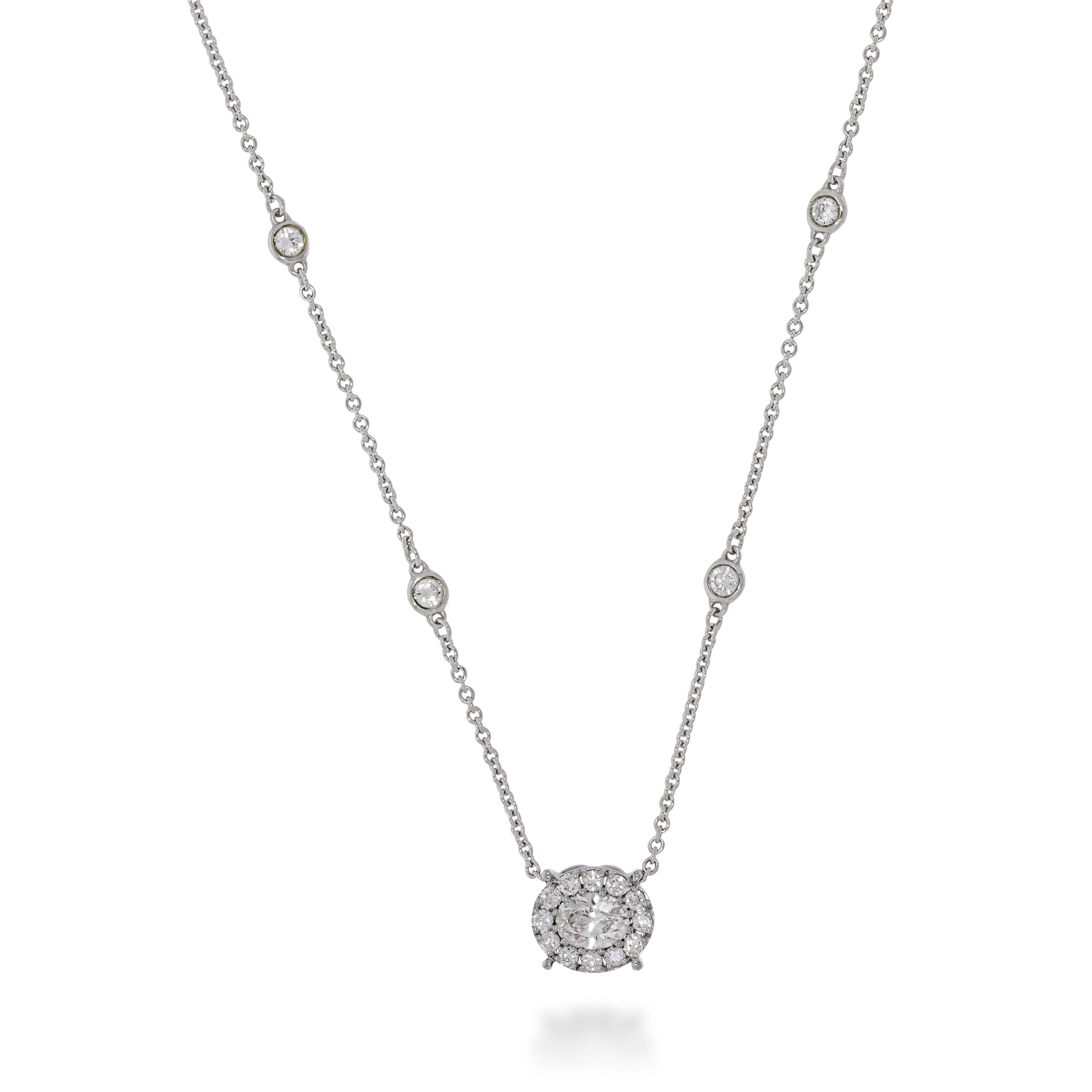 Oval shape diamonds pendant necklace, at the centre of pendant big Oval diamond 0.56ct, halo with rounds small diamonds & with sparkling diamonds on chain