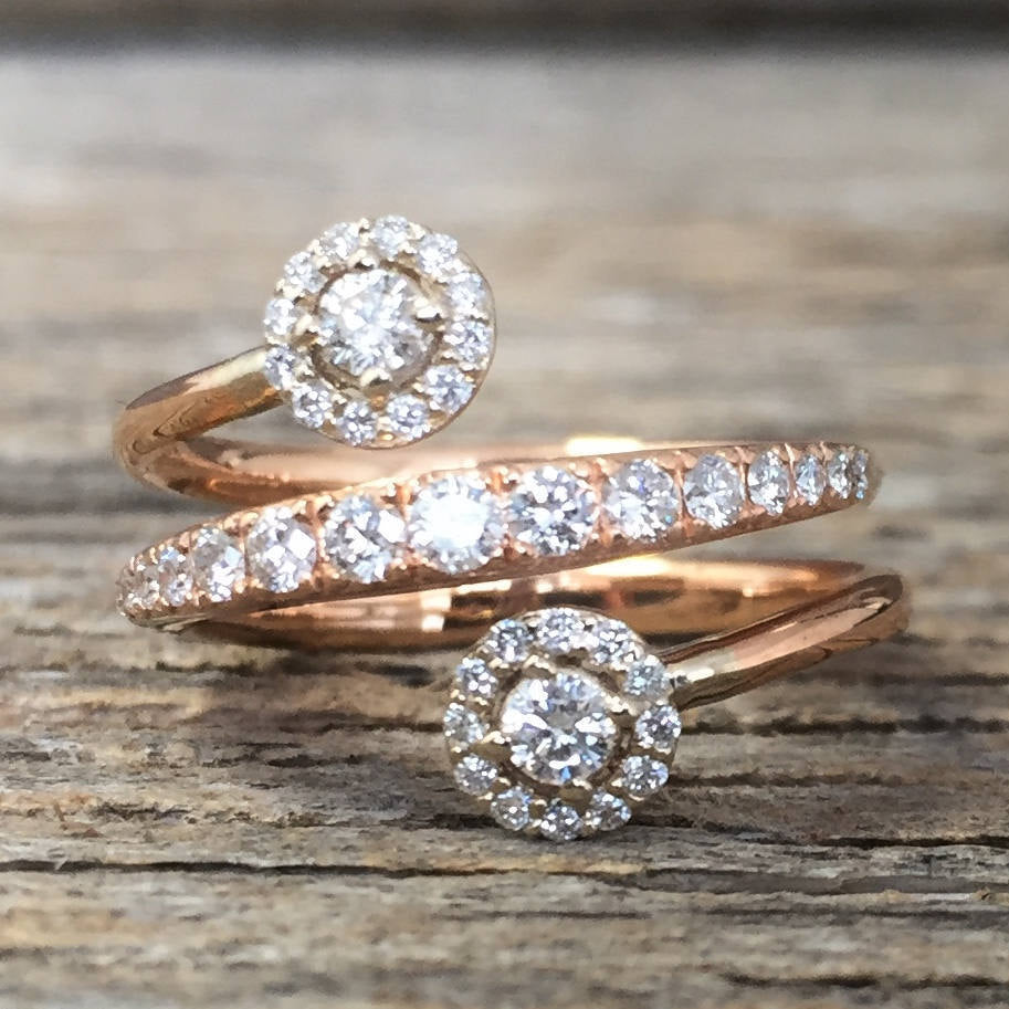 Amazing elegant diamond Spiral Ring features come with two main stones. This fantastic piece of jewelry is suitable for a variety of occasions, whether it is an engagement or any other meaningful moment.