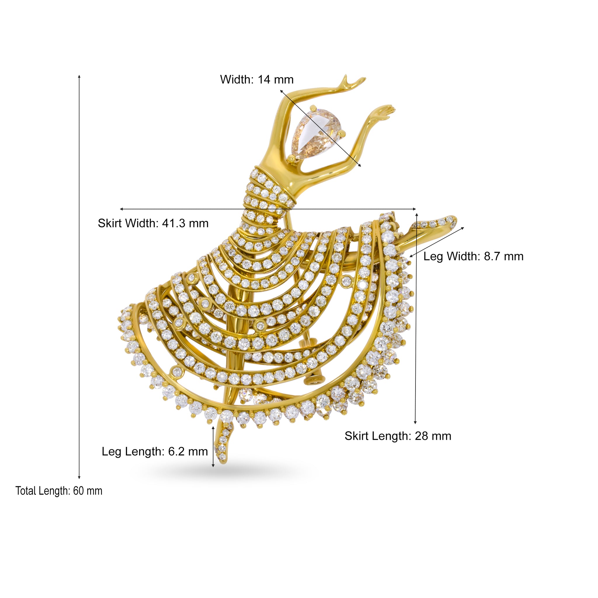 18K yellow gold ballerina pin, set with 4.22 carat white and champagne diamonds, with a large pear-shaped diamond 1.07 carat, as the dancer's face. Elegant and feminine style. A pin that stylishly decorates shirts, jackets and more. A luxurious piece of jewelry that will enhance your fashion taste. Secured with a latch. Can be easily put on a chain and use as a Classic Ballet Dancer Pendant.