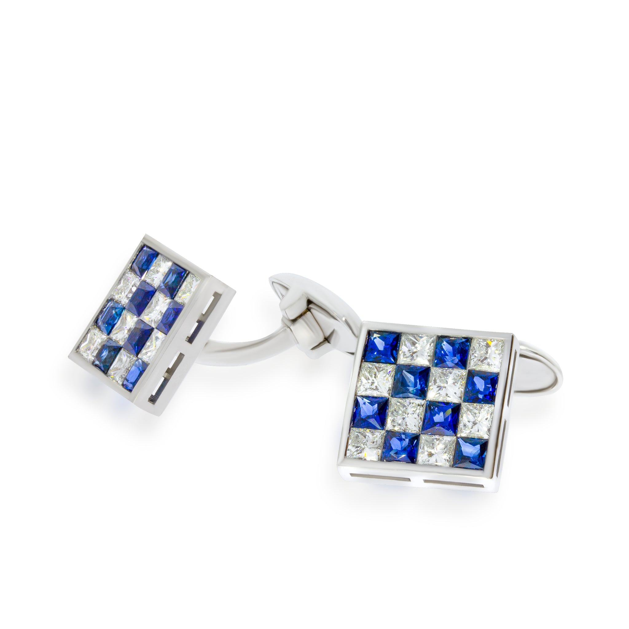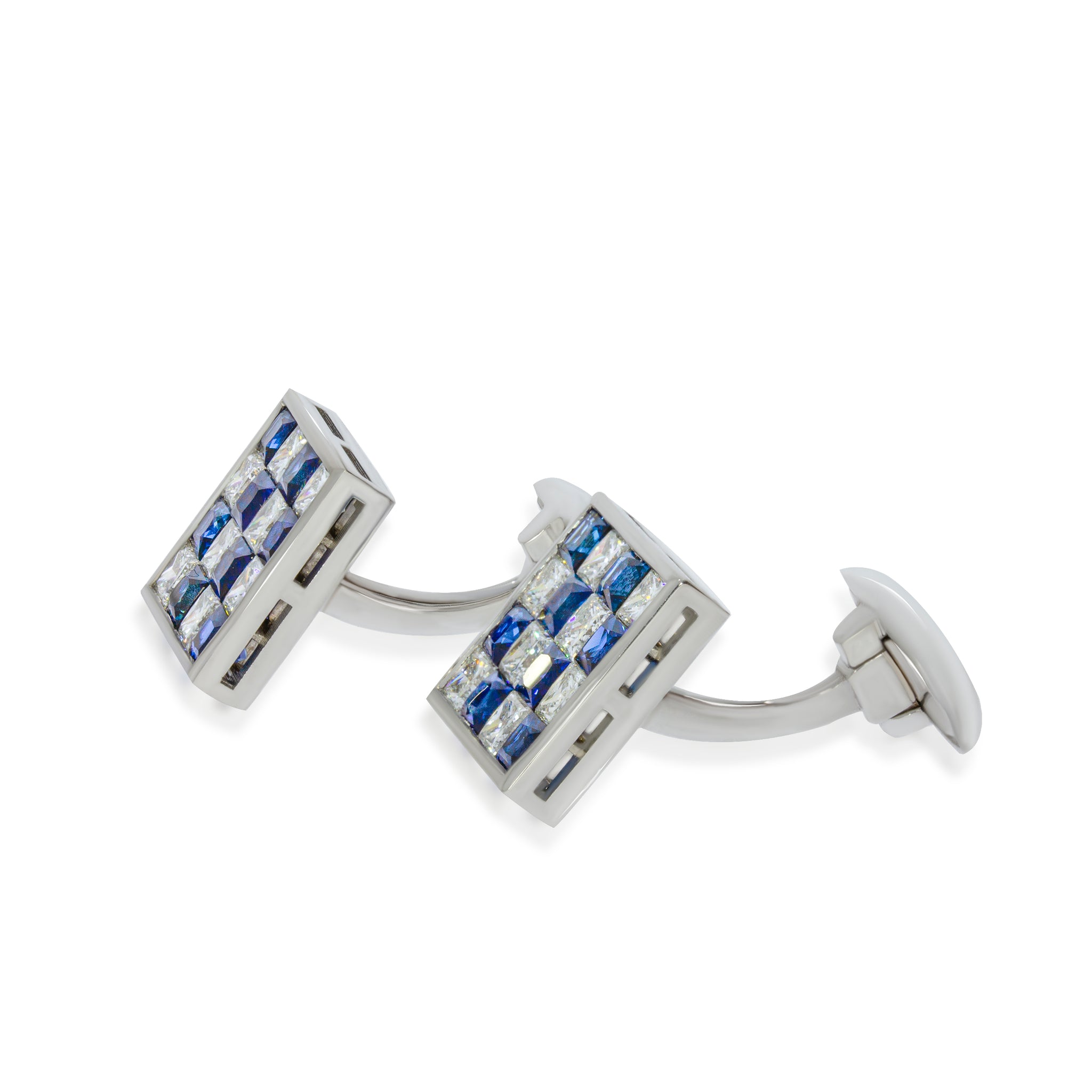 8 (each) Blue Sapphire Invisibly Set Square Cut and 8 (each) Diamonds Princess Cut Invisibly Set on a Square 18k white gold Cufflinks.