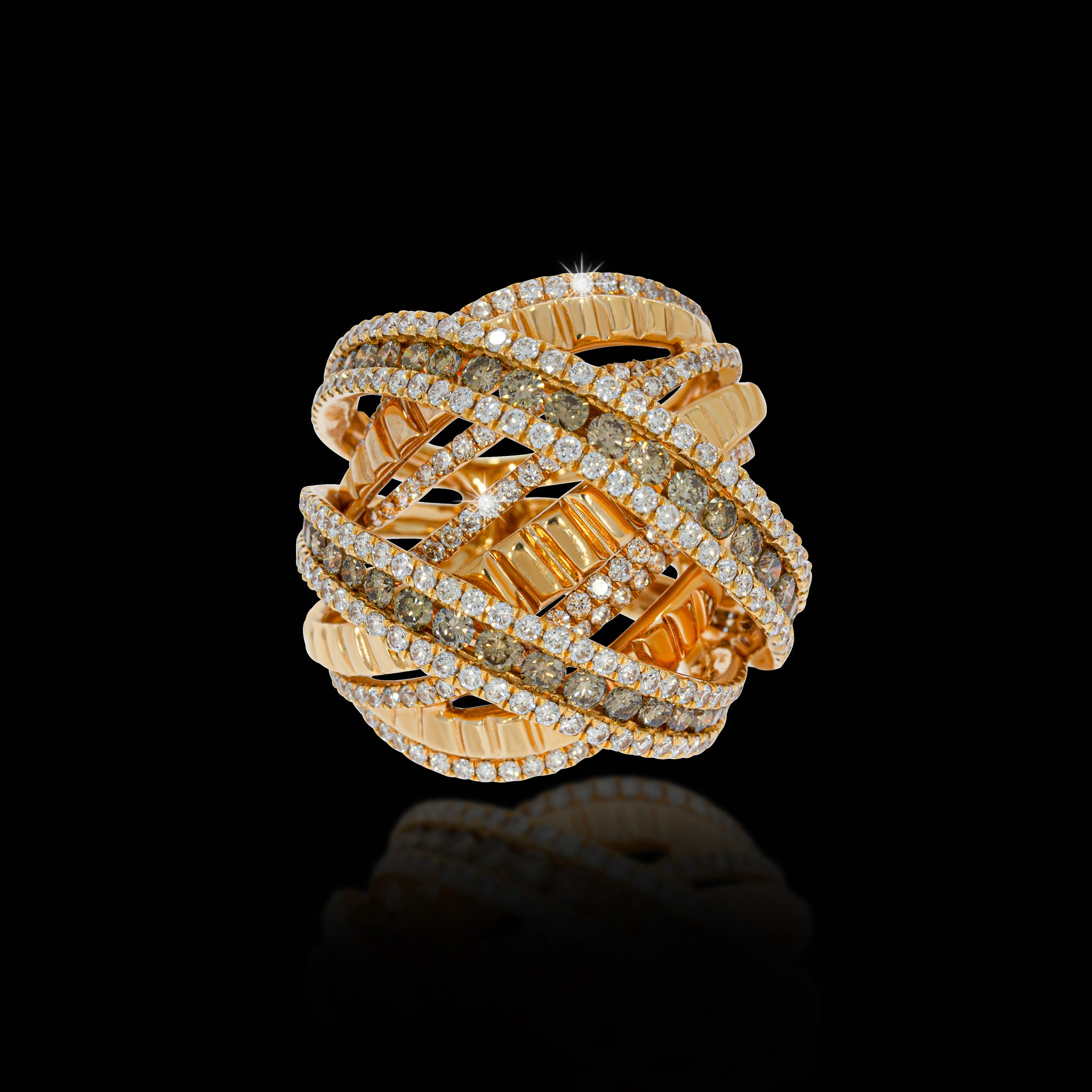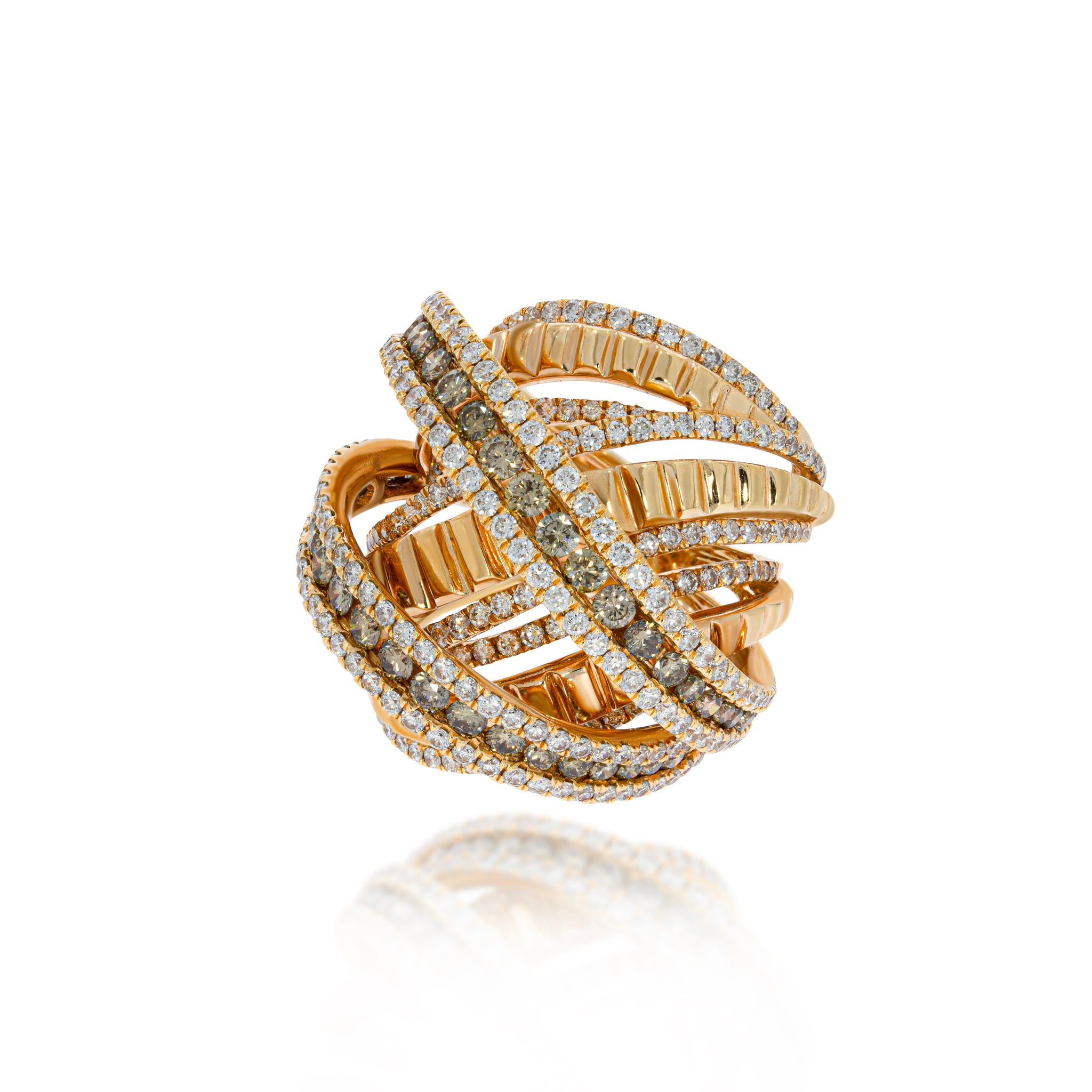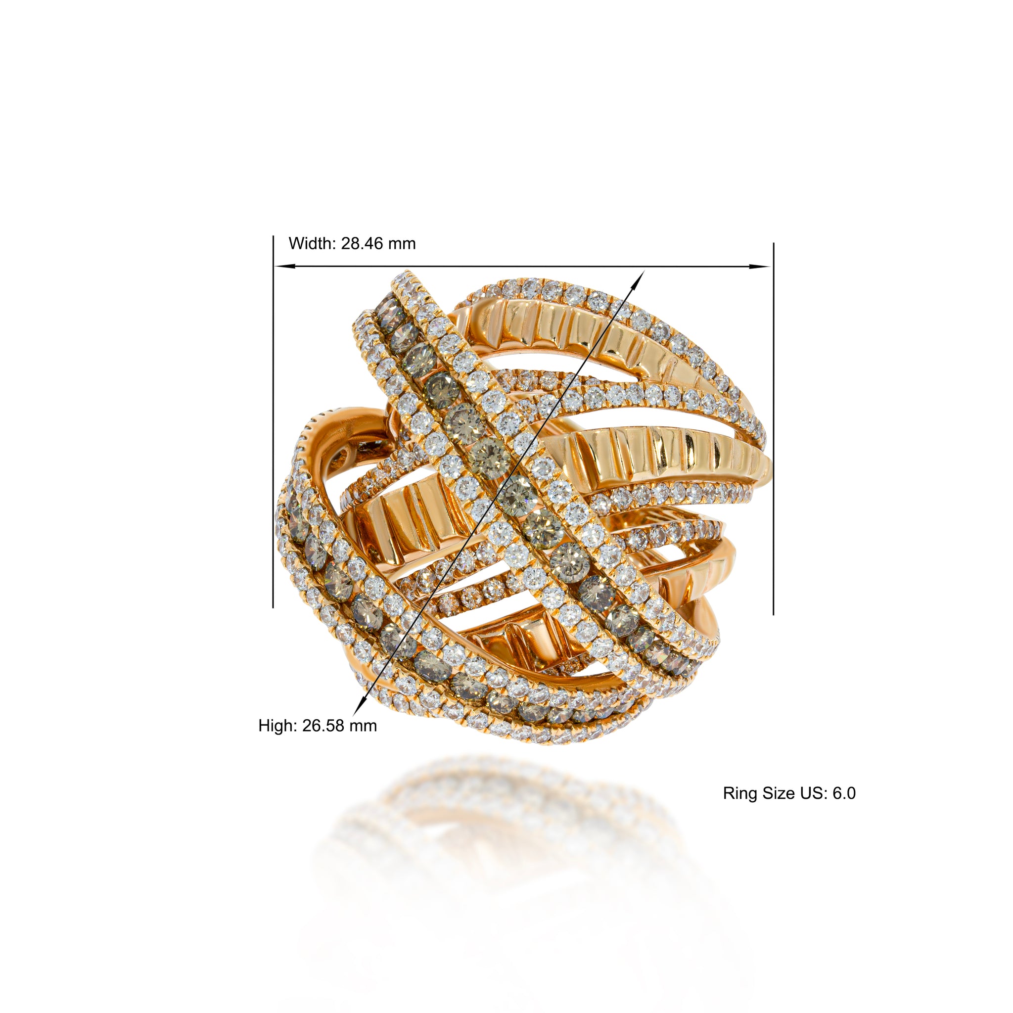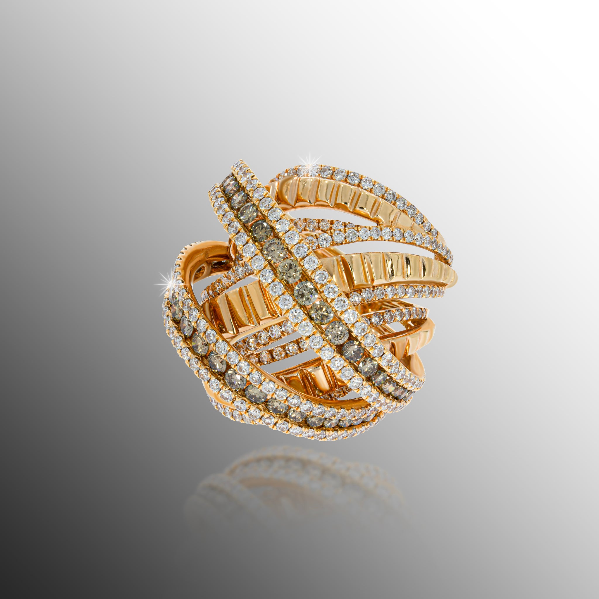 Glamorous Cocktail Diamond Ring, Criss-Cross, Multi-Row, multi layer ring. 18k rose Gold set with Round Brilliant Champagne and white Diamonds