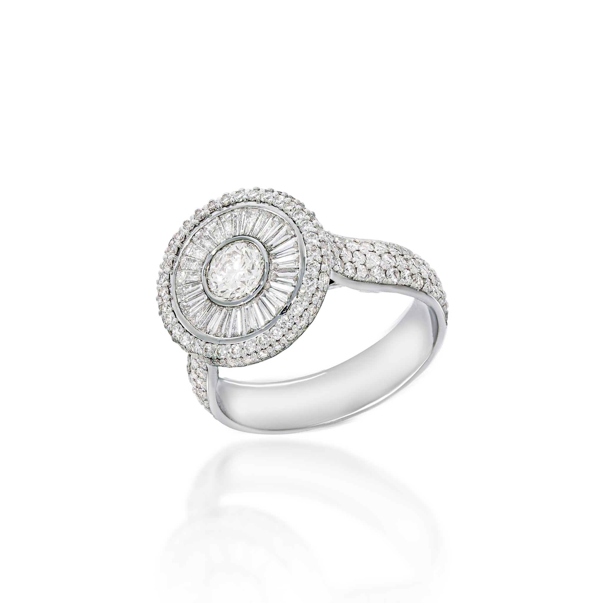 Cocktail statement ring1.93Ct. engagement ring. At the center of the ring head is a round diamond 0.41 Ct diamond, surrounded by circle of Baguette diamonds, and at the 3d and 4d circle round diamonds, the metal of the ring paved with round diamonds as well.