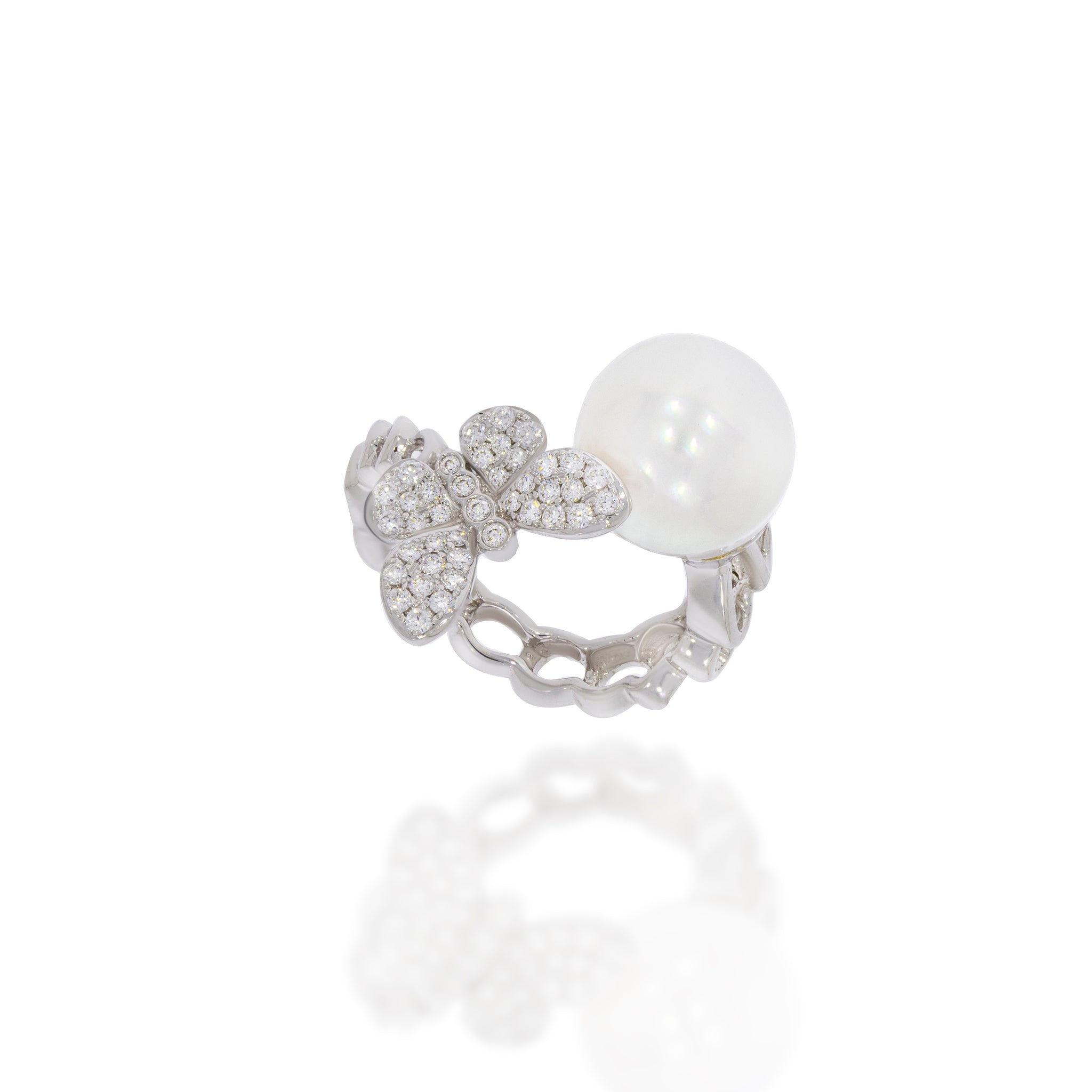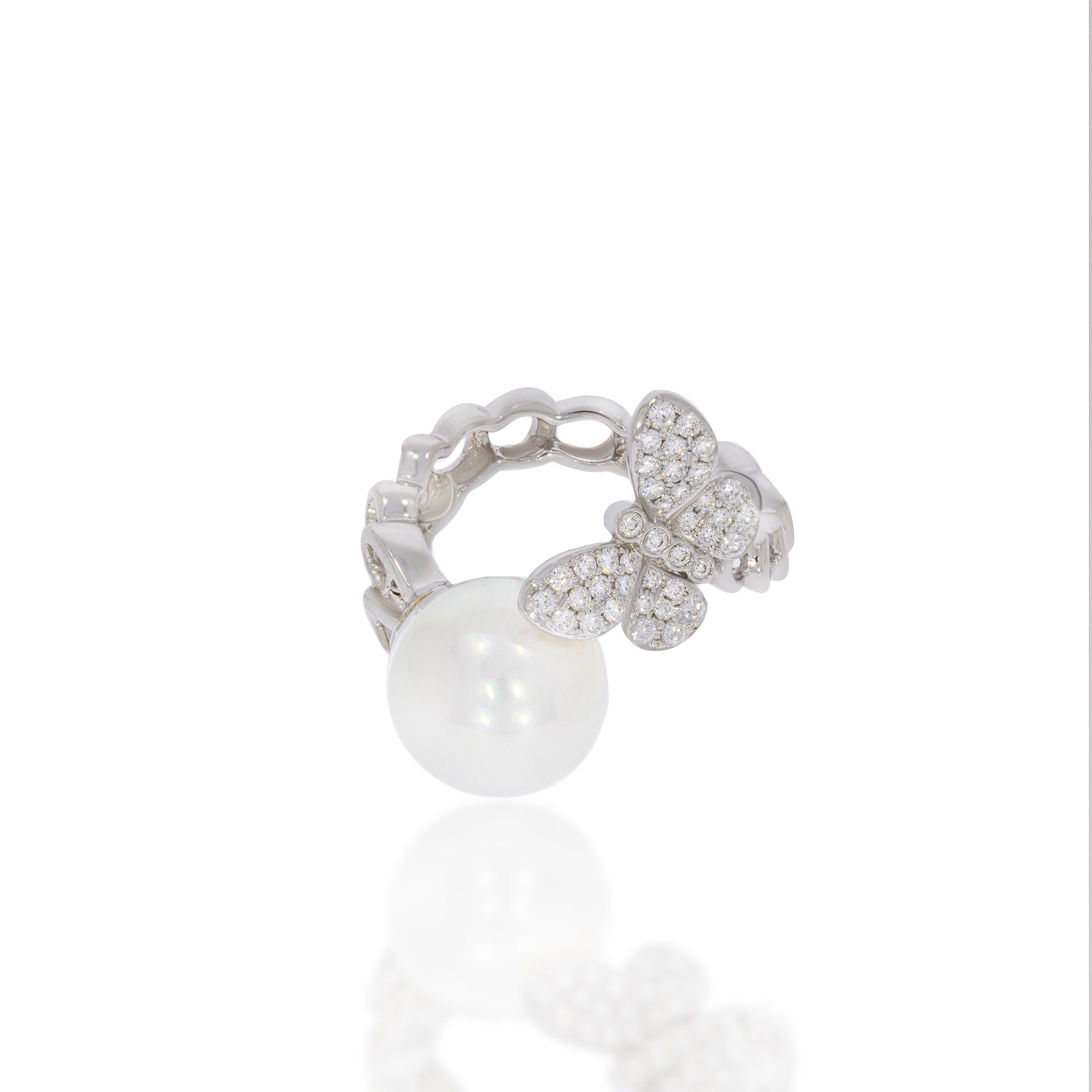 White gold thick chain pearl and diamond ring, beatiful pearl and diamonds pave butterfly. A unique fancy beautiful engagement ring.